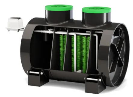 Септик также оснащен системой аэрации и эрлифтов с компрессором, которая позволяет повысить степень очистки септика, что позволит еще реже обслуживать систему почвенной доочистки (дренажную траншею или колодец). Компрессор входит в комплект поставки.