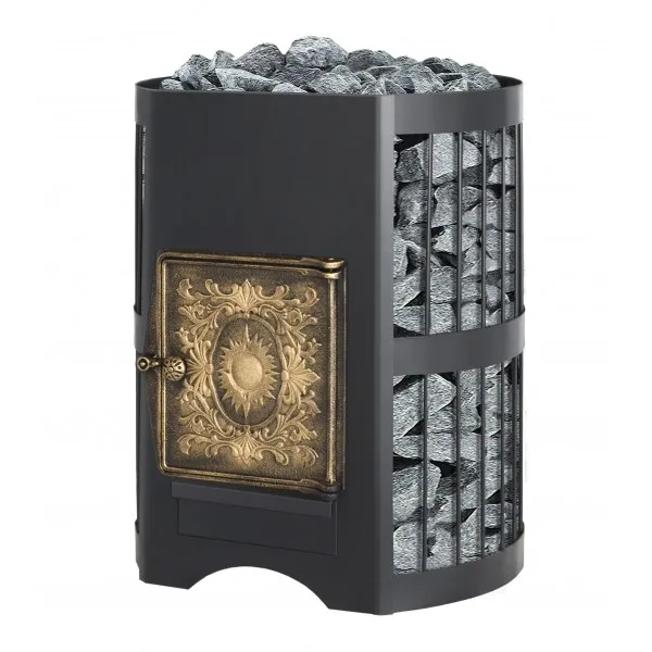 Данная печь имеет высокое КПД, а так же изготовлена из специальной конструкционной стали с элементами топки достигающими 12 мм, которая при высоких температурах не подвергается деформации. Металлическая печь как известно достаточно быстро прогревает помещение, проста в обслуживании и установке. Конвекционно-вентилируемый кожух (сетка) вмещает в себя большое количество камней, которые в свою очередь долго удерживают тепло и не выделяют инфракрасное излучение.