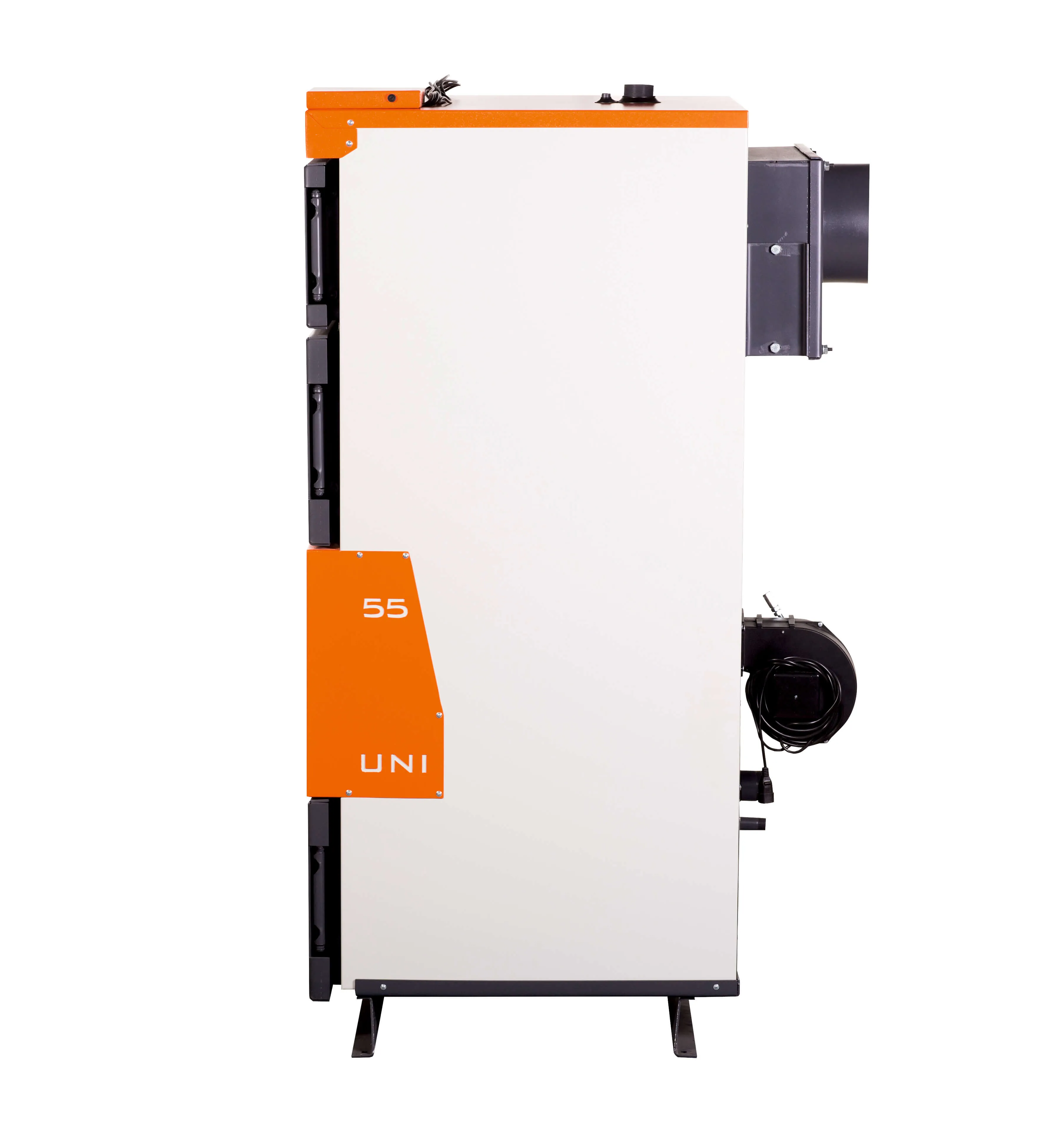 Все котлы серии UNI имеют в заводском комплекте самую современную европейскую автоматику. В стандартную комплектацию входит регулятор, который осуществляет управление модулируемым вентилятором для контроля горением топлива и циркуляционными насосами. Контроль горения может осуществляться с помощью датчика отходящих газов.