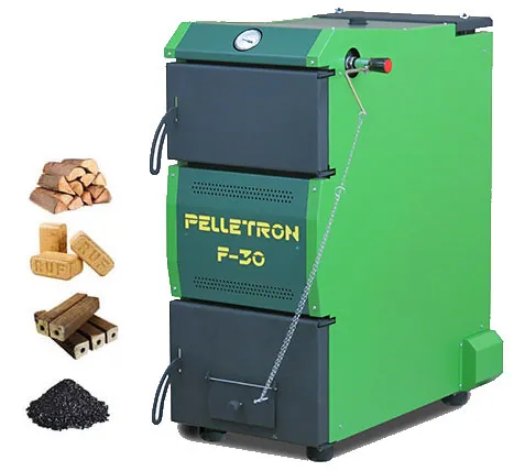 Котел Пеллетрон-F с одинаковой охотой потребляет сырые и сухие дрова, брикет, уголь. Большой объем загрузочной камеры обеспечивает весьма длительную работу котла на одной загрузке. Новейшая технология нижнего горизонтального сжигания топлива снижает химический недожог, а водоохлаждаемый колосник и кожухотрубчатый теплообменник повышают тепловой КПД котла, не позволяя Вашим деньгам вылетать в дымовую трубу. Автоматическое регулирование температуры теплоносителя позволяет котлу работать с любыми системами отопления (радиаторы с воздушным регулированием, теплые полы, бойлер ГВС). Простое и редкое обслуживание котла Пеллетрон-F не отнимет у Вас много времени. Котел Пеллетрон-F это хорошее решение для Вашего дома.