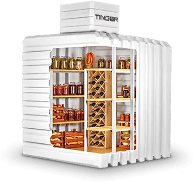 2. Погреб "Тингард" оборудован деревянными полками, полом, приточной и вытяжной вентиляцией, освещением, лестницей и крышкой-люком. Вам не нужно беспокоиться о дополнительном оборудовании.